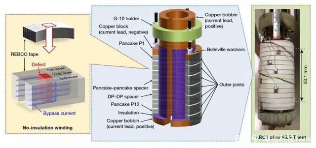 這種磁鐵中的超導(dǎo)體是由一種稱為REBCO(稀土鋇銅氧化物)的新型化合物制成,與45特斯拉的混合動(dòng)力汽車中使用的鈮基超導(dǎo)體相比,它的電流是其兩倍。電流密度的提升至關(guān)重要,因?yàn)殡娏魍ㄟ^(guò)電磁鐵產(chǎn)生磁場(chǎng),如果電流越大,那么產(chǎn)生的磁場(chǎng)就越強(qiáng)。